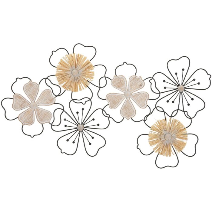 Panel de pared 75x3,5x42 cm, hierro, rafia y MDF, marrón y negro con tonos naturales, diseño floral en 3D con alambre y rafia, rico en contrastes y creativo para salones modernos